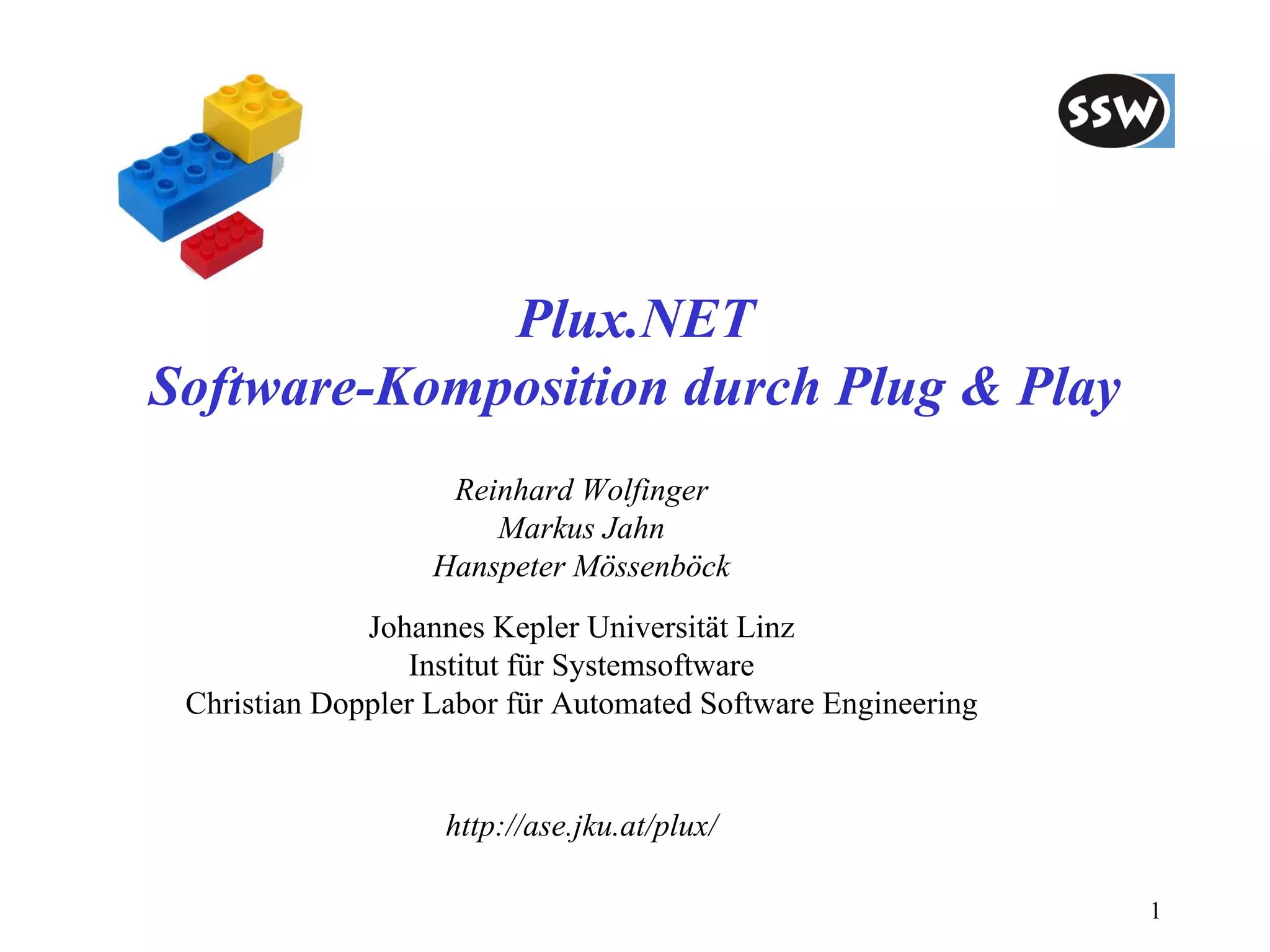 Plux.net ist eine leichtgewichtige Plugin-Plattform für .NET, die eine 'Slot & Plug'-Metapher verwendet und deklarative Komposition via .NET-Attribute ermöglicht. Sie unterstützt dynamisches Anstecken und Abstecken von Plugins, Lazy-Loading, sowie Sicherheitsmechanismen zur Kontrolle, wer Plugins anstecken darf. Zukünftige Arbeiten umfassen die Erweiterung von Plux für Webanwendungen und das Testen von Plugin-Systemen.