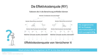 Die Marktanalyse von Fondspolicen ist für Berater aufgrund von intransparenten Kosten und fehlenden Standards eine Herausforderung. Das Dokument bietet Werkzeuge zur eigenständigen Analyse der Kosten und zeigt, dass die effektivkostenquote (RIY) oft nicht aussagekräftig ist, ohne eine genaue Nachrechnung. Eine eigene Berechnung der Kosten anhand des Produktinformationsblatts (PIB) wird empfohlen, um eine realistische Vergleichbarkeit der Angebote zu erhalten.