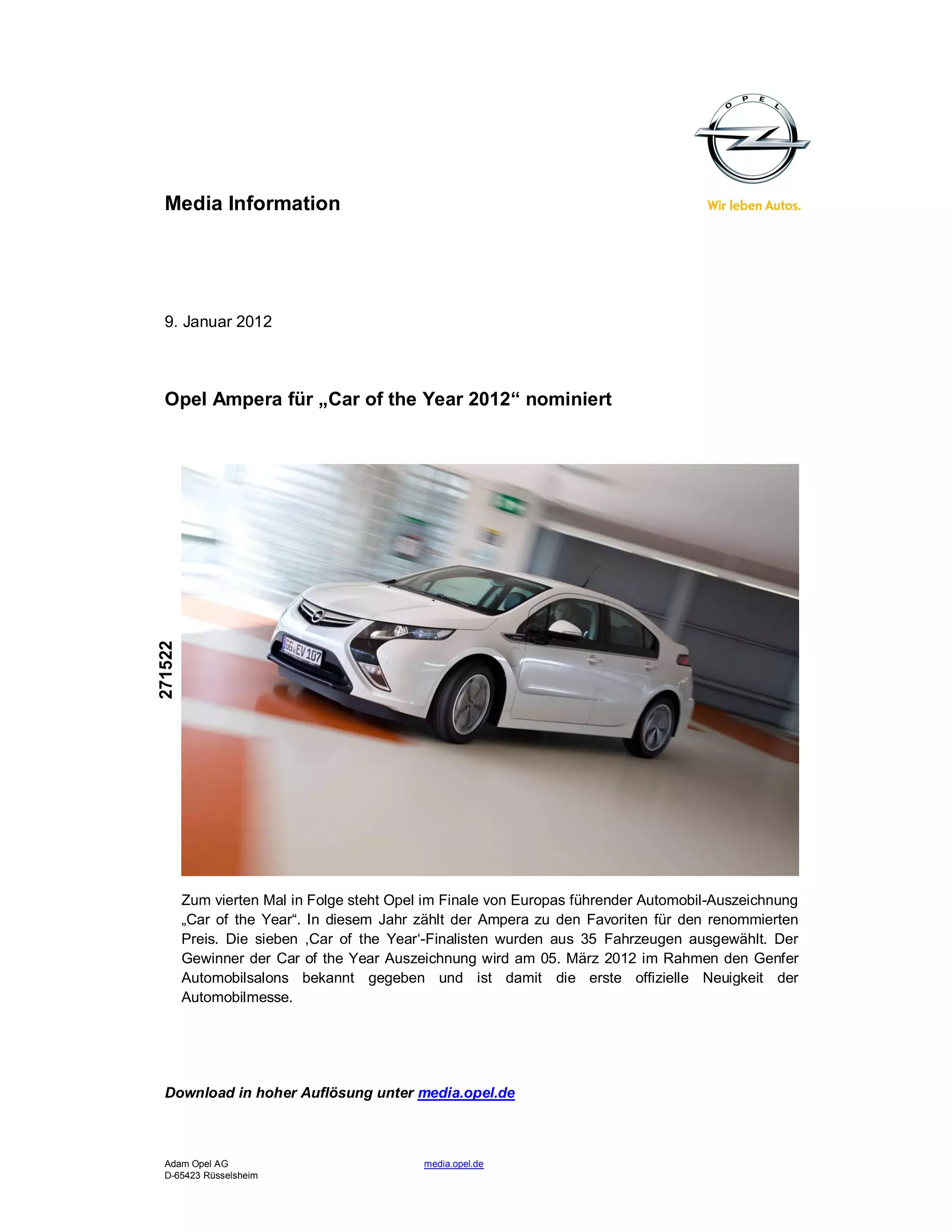 Der Opel Ampera wurde für die Auszeichnung 'Car of the Year 2012' nominiert und steht somit im Finale von Europas führender Automobil-Auszeichnung, zum vierten Mal in Folge für Opel. Aus 35 Fahrzeugen wurden sieben Finalisten ausgewählt, und der Gewinner wird am 5. März 2012 im Rahmen des Genfer Automobilsalons bekannt gegeben.