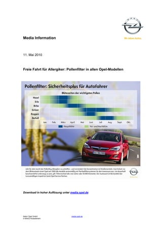 Opel bietet ab sofort in allen Modellen einen Pollenfilter an, der Allergikern eine freie Fahrt ermöglicht. Dies wurde am 11. Mai 2010 bekannt gegeben. Hochauflösende Bilder sind auf der Opel-Website verfügbar.