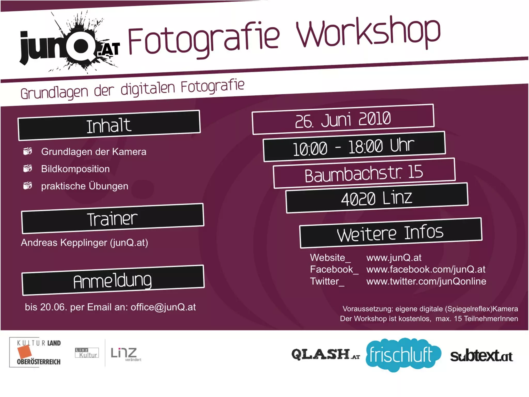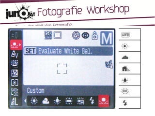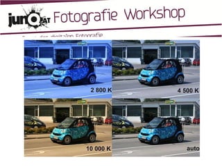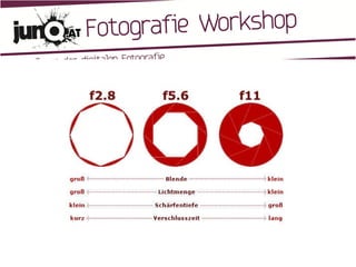 Das Dokument beschreibt einen Fotoworkshop mit verschiedenen Themen, darunter Kamera-Technik, Belichtungsmessung und Bildkomposition. Es werden die Grundlagen der Fotografie behandelt, einschließlich Kameraeinstellungen wie Brennweite, Blende und ISO sowie häufige Fehler bei der Fotografie und deren Vermeidung. Darüber hinaus werden die 10 goldenen Regeln der Lomographie vorgestellt, um die Kreativität und den künstlerischen Ausdruck beim Fotografieren zu fördern.