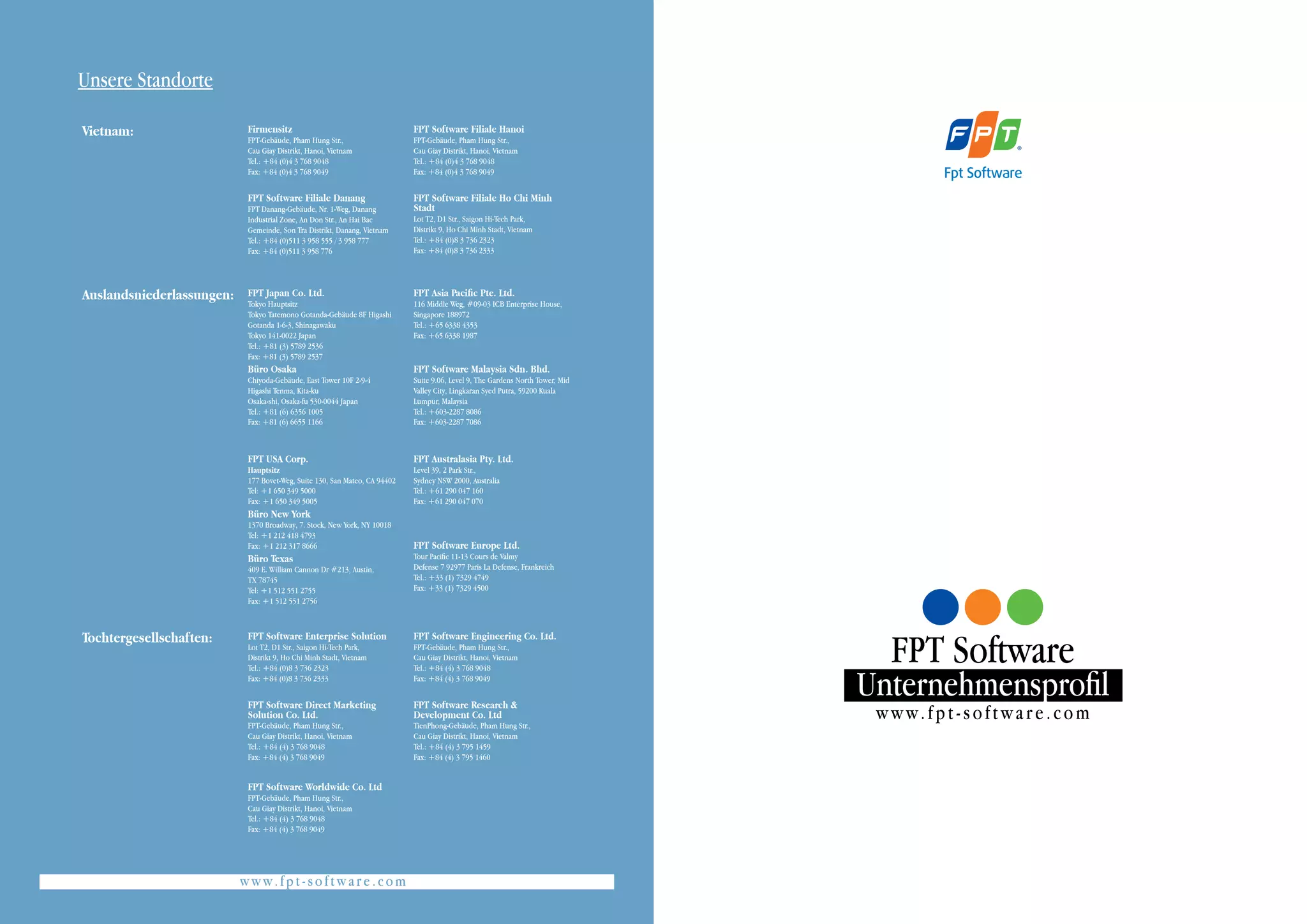 FPT Software, 1988 gegründet, ist ein führendes vietnamesisches Softwareunternehmen mit globaler Präsenz, einschließlich Niederlassungen in Japan, den USA, Frankreich und Australien. Das Unternehmen bietet umfassende Softwaredienstleistungen an, darunter Anwendungsentwicklung, Qualitätssicherung und Business Process Outsourcing, und hat strategische Allianzen mit großen Technologieanbietern wie Microsoft und IBM gebildet. FPT Software strebt an, ein Top-Anbieter im Bereich Outsourcing und Softwareentwicklung zu sein, unterstützt durch ein engagiertes Team und zahlreiche Zertifizierungen in Qualitätsmanagement.