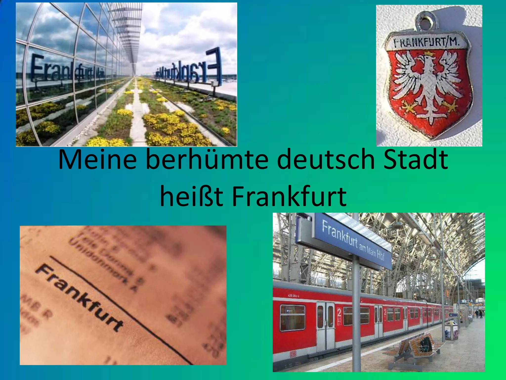 Frankfurt ist die Hauptstadt von Hessen, Deutschland, und bekannt als das finanzielle Zentrum des Landes. Die Stadt bietet zahlreiche Sehenswürdigkeiten, darunter den Commerzbank Tower, den Europaturm und die Alte Oper. Frankfurt verfügt zudem über schöne Parks, Museen und eine wichtige Einkaufsstraße namens Zeil.