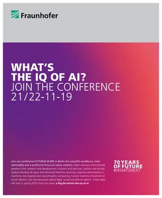 Das Dokument beschreibt die Geschichte, Entwicklung und zukünftige Ausrichtung der Fraunhofer-Gesellschaft, die seit ihrer Gründung 1949 eine zentrale Rolle in der angewandten Forschung in Deutschland spielt. Es hebt die Bedeutung von Innovationen und Fortbildung für die Wettbewerbsfähigkeit hervor und kündigt bevorstehende Veranstaltungen wie die Konferenz "What’s the IQ of AI" an. Zudem werden aktuelle Themenfelder der Forschung und die Erfolge der Gesellschaft in verschiedenen technischen Bereichen vorgestellt.