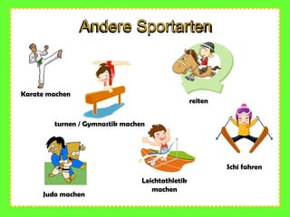 Das Dokument beschreibt verschiedene Sportarten und die Fähigkeiten verschiedener Personen in Bezug auf diese Aktivitäten. Es stellt fest, wer welche Sportarten ausüben oder nicht ausüben kann, wie z.B. Schwimmen, Surfen und Fußball. Durch Fragen und Antworten wird interaktiv erörtert, wer was machen kann.