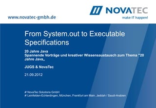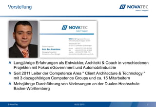 Das Dokument beschreibt die Erfahrungen von Novatec Solutions GmbH mit der Entwicklung und den Herausforderungen im Bereich Java über 20 Jahre, insbesondere in eGovernment und der Automobilindustrie. Es werden Methoden zur Verbesserung der Zusammenarbeit zwischen verschiedenen Experten und zur Erstellung ausführbarer Spezifikationen vorgestellt, um Probleme in der Anforderungsanalyse und Testphase zu lösen. Der Fokus liegt auf der Automatisierung der Validierung, der Erstellung lebender Dokumentationen und der effizienten Trennung von Tests und Code.