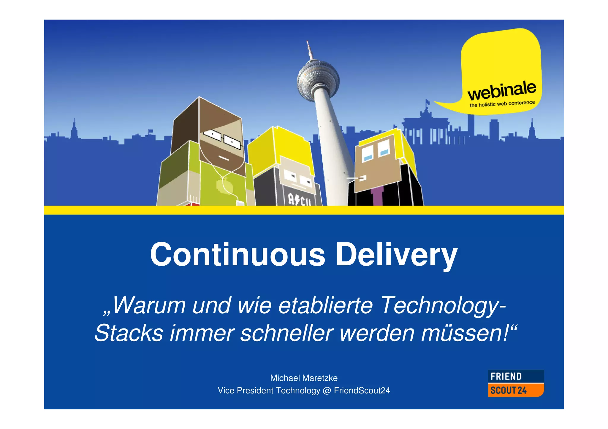 Das Dokument behandelt die Implementierung von Continuous Delivery bei Friendscout24, um die Release-Zeiten auf zwei Stunden zu verkürzen und die Effizienz zu steigern. Es erläutert die Herausforderungen, wie Abhängigkeiten zwischen Back- und Frontend sowie den hohen Aufwand bei Releases, und stellt einen planmäßigen Ansatz mit schrittweisen Verbesserungen vor. Abschließend werden technologische Strategien, Teamentwicklungen und Lessons Learned dokumentiert.
