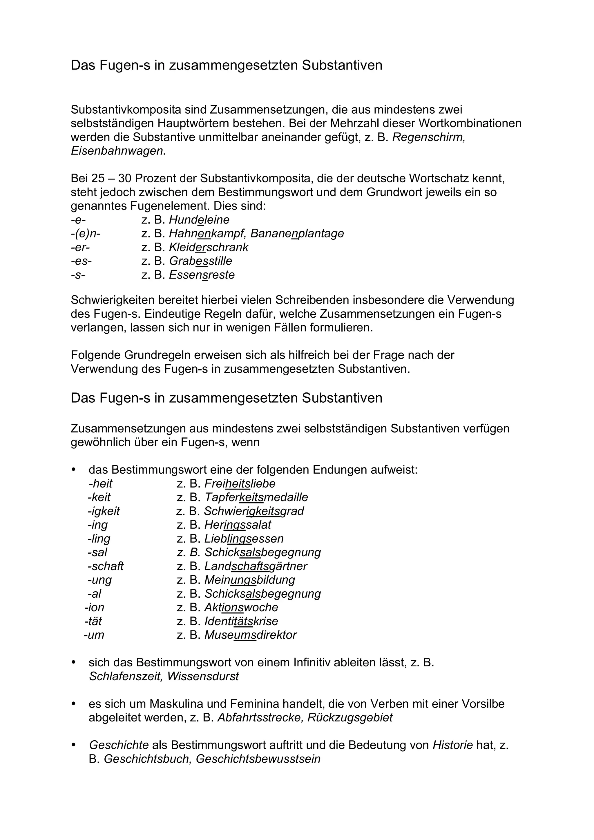 Das Dokument erklärt die Verwendung des Fugen-s in zusammengesetzten Substantiven, die aus mindestens zwei Hauptwörtern bestehen und in 25-30% der Fälle ein Fugen-s beinhalten. Es werden hilfreiche Grundregeln für die Bestimmung der Einsatzmöglichkeiten des Fugen-s dargelegt, einschließlich bestimmter Endungen der Hauptwörter. Die Unsicherheiten bei der Verwendung des Fugen-s, insbesondere im Zusammenhang mit dem Wort 'Steuer', werden ebenfalls thematisiert.