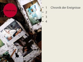 Das Dokument bietet eine Chronik der Ereignisse rund um die Fukushima-Daiichi-Kernkraftwerkskatastrophe, die am 11. März begann. Es beschreibt das Epizentrum des Erdbebens in der Nähe des Kraftwerks und die unmittelbaren Folgen. Die Gliederung des Dokuments weist auf eine detaillierte Auflistung der Ereignisse hin.