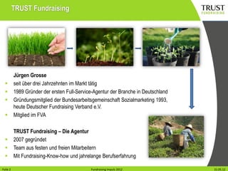 Das Dokument präsentiert Informationen über Fundraising-Strategien und -Kampagnen in Österreich, verfasst von Jürgen Grosse, der über 30 Jahre Erfahrung im Bereich hat. Es werden Ansätze zur Steigerung der Markenbekanntheit für Non-Profit-Organisationen (NPOs) und verschiedene Werbemaßnahmen wie Social Media, Print und Events ausführlich beschrieben. Außerdem wird der Spendenmarkt anhand spezifischer Kampagnenbeispiele analysiert.