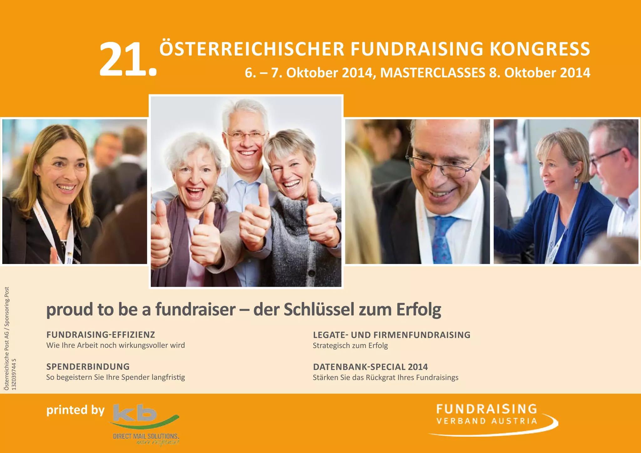 Der 21. österreichische Fundraising-Kongress fand vom 6. bis 8. Oktober 2014 statt und bot ein umfassendes Programm mit Keynotes, Podiumsdiskussionen und Masterclasses zu Themen der Fundraising-Effizienz und Spenderbindung. Experten aus verschiedenen Ländern diskutierten über aktuelle Herausforderungen und Strategien im Fundraising, während das spezielle Datenbank-Special am 7. Oktober Einblicke in moderne Datenbanktechnologien gab. Die Veranstaltung richtete sich sowohl an erfahrene Fundraiser als auch an kleinere Organisationen, die durch Stipendien unterstützt wurden.