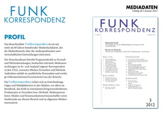 Die Mediadaten der Funkkorrespondenz, gültig ab dem 1. Januar 2012, bieten umfassende Informationen über die Medienbranche, einschließlich Programmkritiken und medienpolitischen Entwicklungen. Der Fachdienst informiert regelmäßig über wichtige Ereignisse in Fernsehen und Hörfunk und richtet sich an Fachkreise wie Journalisten und Medienwissenschaftler. Zudem werden Anzeigenpreise und Formate für verschiedene Seiten und Formate à la carte aufgeführt.