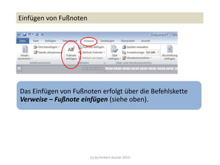 Das Dokument beschreibt den Prozess des Einfügen von Fußnoten in einem Text über die Befehlskette 'Verweise – Fußnote einfügen'. Bei der Erstellung von Fußnoten kann auch ein Zitat eingefügt werden, wobei das Format der Zitation den Normen ISO 690 entspricht, entweder in Form von Autorennamen und Jahr oder als numerische Referenz. Zwei Abbildungen illustrieren die unterschiedlichen Formate zur Darstellung der Fußnoten.