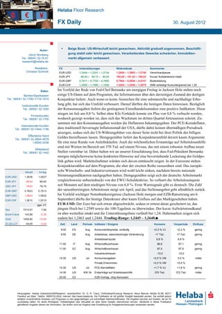 Die US-Wirtschaft zeigt leichte Wachstumsanzeichen, wobei die Konsumausgaben im Juli um 0,8 % gestiegen sind, was auf ein anhaltendes Wachstum im dritten Quartal hindeutet. Die bevorstehende Rede von Fed-Chef Bernanke könnte keine Hinweise auf eine Lockerung der Geldpolitik liefern, was Marktteilnehmer enttäuschen könnte. In der Eurozone zeigen sich leichte Rückgänge im Wirtschafts- und Industrievertrauen, während die Arbeitslosenquote stabil bleibt, jedoch erste Warnsignale in Bezug auf steigende Arbeitslosenzahlen auftreten.