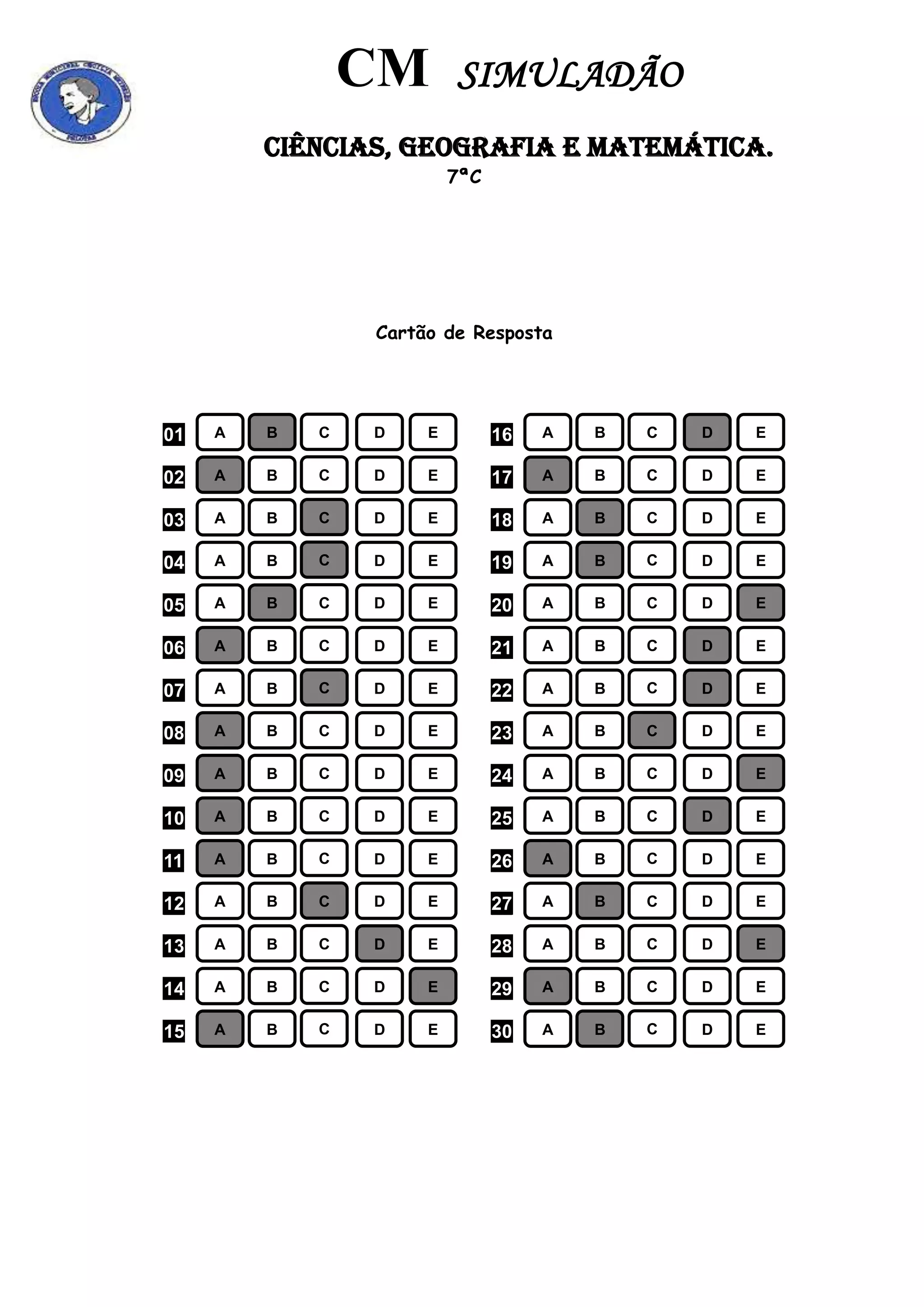 Das Dokument ist ein Antwortblatt für einen simulierten Test in den Fächern Naturwissenschaften, Geografie und Mathematik. Es enthält eine Liste von Antwortmöglichkeiten von A bis E für verschiedene Fragen. Die Struktur umfasst 30 Fragen mit den entsprechenden Antwortoptionen.