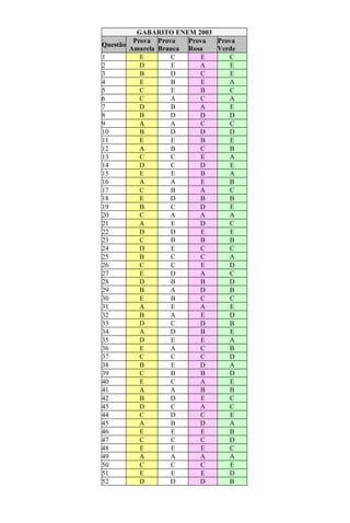 Das Dokument enthält die Antworten zu den Fragen der ENEM-Prüfung 2003 in verschiedenen Farben. Jede Antwort ist durch Buchstaben codiert und in einer numerischen Reihenfolge aufgelistet. Die Antworten umfassen die Fragen 1 bis 63.