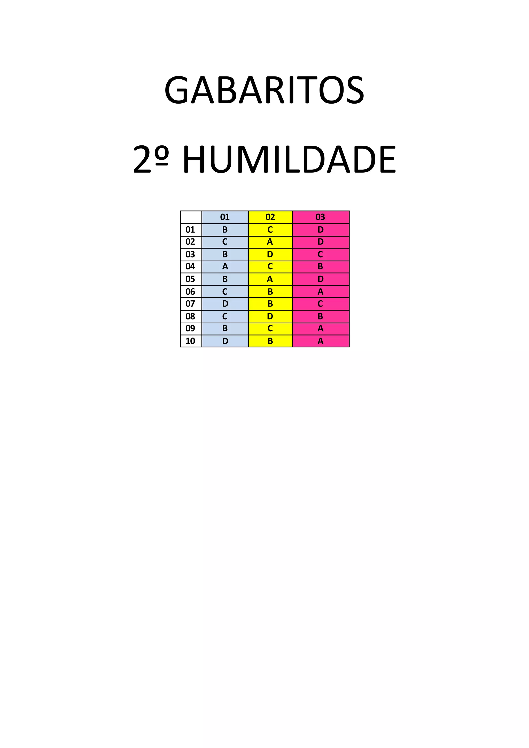 Das Dokument enthält eine Liste von Antworten oder Lösungen für einen Test oder eine Umfrage, die aus einer Reihe von Fragen und deren jeweiligen Antwortoptionen besteht. Es sind mehrere Fragen (01 bis 10) aufgelistet, die durch Buchstaben (a, b, c, d) bezeichnete Antworten haben. Dies scheint eine Sammlung von gabaritos für eine schulische oder prüfungsbezogene Evaluation zu sein.