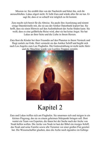 In 'Galaxien der Liebe 5' von Norbert Reinwand versucht Zara, Luzifer zu stoppen, der die Arche von Noah sucht, um eine Armee genetisch veränderter Kreaturen zu erschaffen. Mit ihrem Partner Lukas begibt sie sich auf eine gefährliche Reise zu einem geheimen Stützpunkt und schließlich zum Berg Ararat, wo sie die Arche vermuten. Doch das Abenteuer wird kompliziert, als ihr Führer Professor Müller seine wahren Motive enthüllt und sie vor einer fatalen Entscheidung stellt.