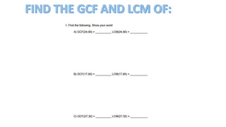 Das Dokument enthält mehrere Übungen zur Bestimmung des größten gemeinsamen Faktors (GCF) und des kleinsten gemeinsamen Vielfaches (LCM). Es werden mindestens sechs Übungen zum Thema angeboten. Es ist eine praktische Übungseinheit, die zur Vertiefung dieser mathematischen Konzepte dient.