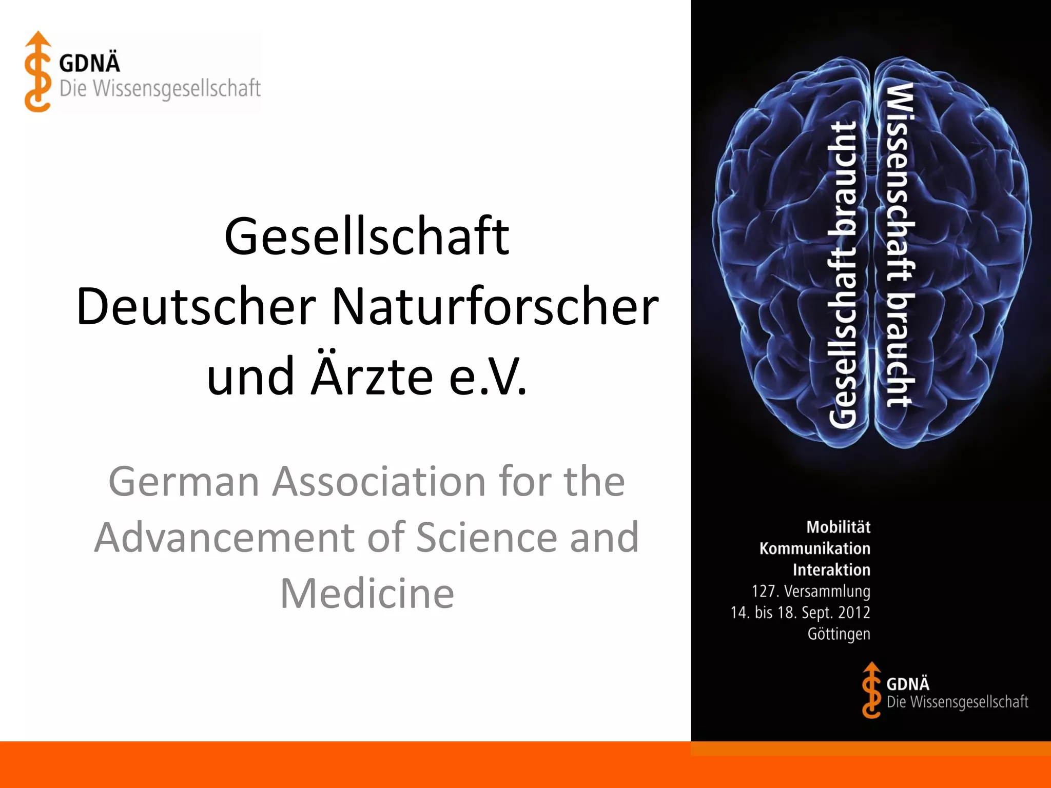 Die Gesellschaft deutscher Naturforscher und Ärzte e.V. (GDNÄ) fördert den wissenschaftlichen Austausch über verschiedene Disziplinen hinweg und strebt eine engere Verbindung zwischen Wissenschaft und Gesellschaft an. Die 127. Versammlung, die vom 14. bis 18. September 2012 in Göttingen stattfand, thematisierte die Abhängigkeiten zwischen gesellschaftlichen Entwicklungen und der Wissenschaft. Zudem wird auf die Wichtigkeit der wissenschaftlichen Bildung und Öffentlichkeitsarbeit hingewiesen.
