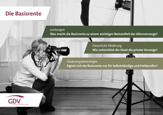 Die Basisrente ist ein staatlich gefördertes privates Altersvorsorgeprodukt, besonders geeignet für Selbstständige und Freiberufler, die keine gesetzliche Rente erhalten. Sie funktioniert nach dem Prinzip der Kapitaldeckung, bietet steuerliche Vorteile und Flexibilität bezüglich der Beitragszahlungen und Zusatzleistungen, wie Absicherungen für Lebensrisiken. Abnahmen der Rente erfolgen als lebenslange Leibrente, die erst ab 60 bzw. 62 Jahren ausgezahlt wird und unterliegt einem Übertragungsverbot sowie einer steuerlichen Behandlung, die mit der gesetzlichen Rente vergleichbar ist.