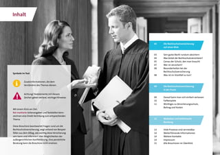 Das Dokument informiert über die Leistungen der Rechtsschutzversicherung, die unter anderem Kosten für Anwälte, Gerichtskosten und Mediation abdeckt. Es werden Beispiele für verschiedene Streitfälle, wie Nachbarschaftsstreitigkeiten und Verkehrsunfälle, sowie die Wichtigkeit einer rechtzeitigen Absicherung dargestellt. Zudem gibt es Hinweise zu nicht versicherten Bereichen und den Ablauf im Streitfall, einschließlich der Rolle des Rechtsschutzversicherers.