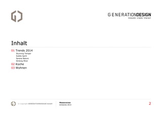 Das Dokument beschreibt die Trends des Ambiente 2014, darunter neue Farb- und Materialspiele, funktionale Küchenhelfer und wohnliche Designs mit skandinavischer Klarheit. Es betont die Bedeutung von Handwerkskunst, Einfachheit und einem kreativen Umgang mit Materialien. Zudem werden innovative Küchen- und Wohntrends vorgestellt, die sowohl Funktionalität als auch ästhetischen Anspruch vereinen.
