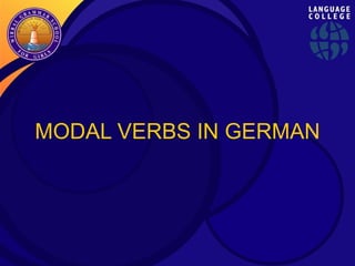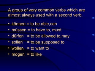 Das Dokument beschreibt die Verwendung von Modalverben im Deutschen, die fast immer mit einem zweiten Verb verwendet werden. Es listet die Modalverben 'können', 'müssen', 'dürfen', 'sollen', 'wollen' und 'mögen' auf und erklärt deren unregelmäßige Konjugation im Singular sowie Beispiele für deren Anwendung. Die Beispiele verdeutlichen, wie man die Modalverben im Satzkonstrukt nutzt und das Infinitivverb ans Ende setzt.