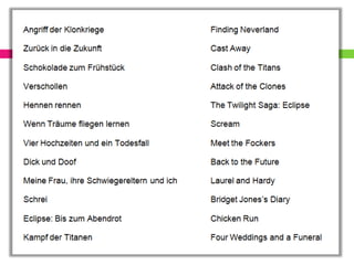 Das Dokument behandelt die Diskussion über Fernsehsendungen, einschließlich der Vorlieben und der Verwendung von Relativsätzen zur Beschreibung. Es enthält auch eine Filmkritik des Films 'Mamma Mia', in der die Handlung, die Themen und die Darsteller analysiert werden. Zudem wird auf Fragen eingegangen, die bei Gesprächen über Fernsehsendungen helfen sollen.