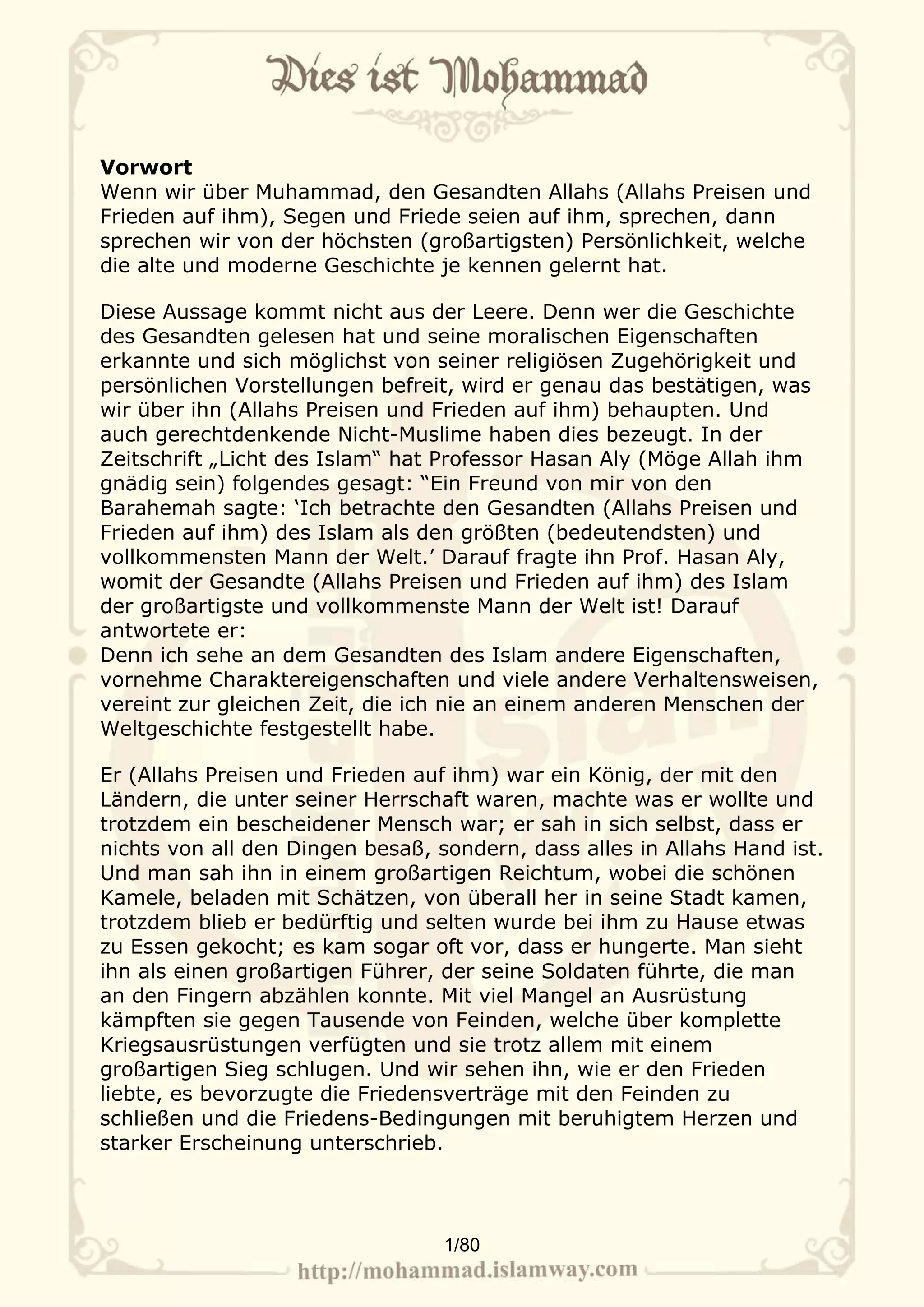Das Dokument diskutiert die herausragenden moralischen Eigenschaften und die außergewöhnliche Persönlichkeit des Propheten Muhammad (Friede sei mit ihm), die ihn als den bedeutendsten Menschen der Geschichte auszeichnen. Es hebt hervor, dass selbst Nicht-Muslime, einschließlich Orientalisten, seine edle Abstammung und ethische Führung anerkennen, während es Muslimen und Interessierten dienen soll, mehr über ihn und den Islam zu lernen. Der Text betont zudem seine Demut, seine Friedensliebe und seine Rücksicht auf die Menschheit, während er gleichzeitig für den Glauben kämpfte und seine Anhänger zur Rechtleitung führte.