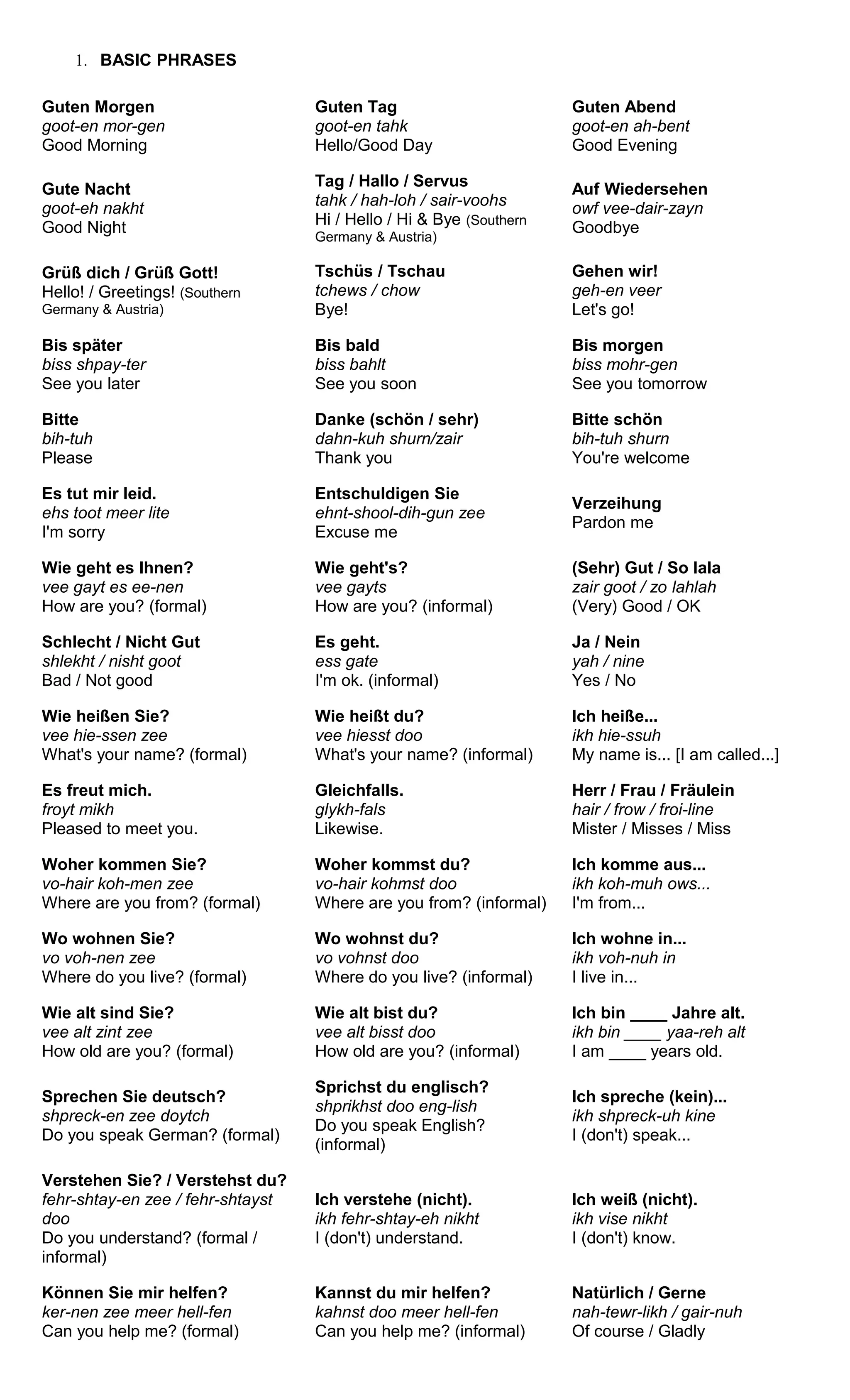 Das Dokument bietet eine umfassende Einführung in grundlegende deutsche Phrasen und deren Aussprache. Es deckt essentielle Themen wie den Umgang mit Nomen und deren Geschlecht, der deutschen Grammatik, einschließlich der Fälle, sowie nützliche Ausdrücke und Vokabeln ab. Zusätzlich werden grundlegende Informationen zur deutschen Aussprache und zum deutschen Alphabet bereitgestellt.