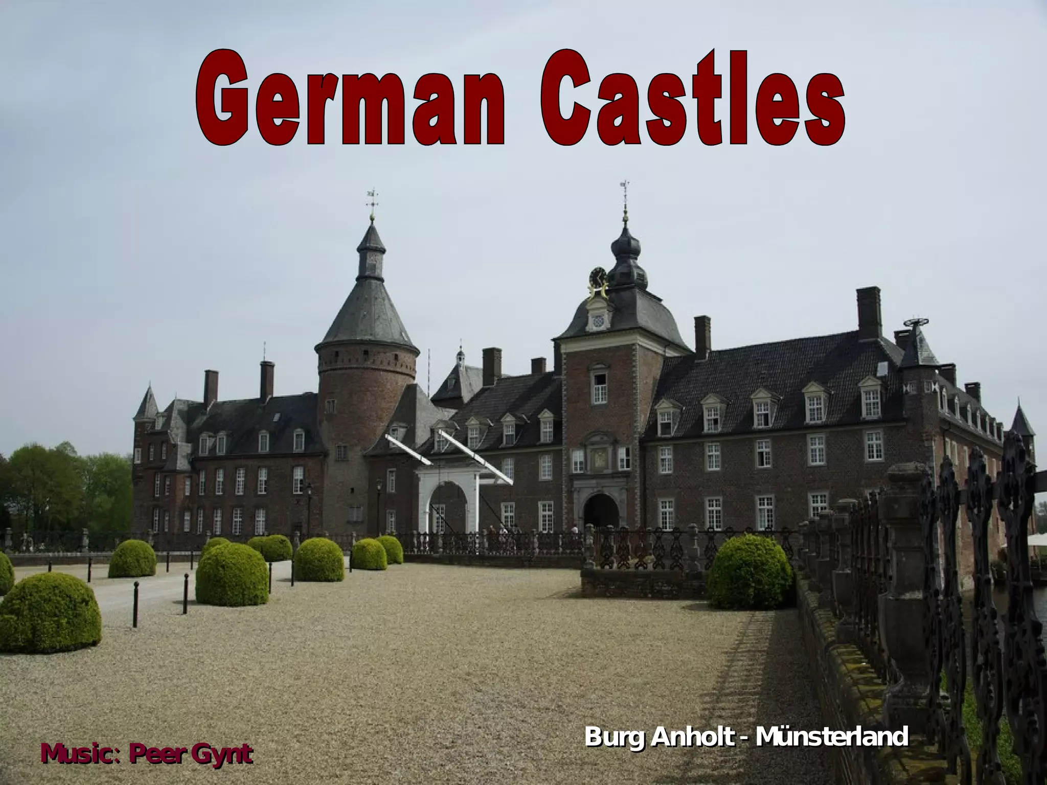 Das Dokument listet verschiedene Burgen und Schlösser in Deutschland, einschließlich ihrer Standorte wie Neuschwanstein in Bayern und Wartburg in Thüringen. Es wird auch auf die musikalische Begleitung zur Präsentation verwiesen, die Peer Gynt umfasst. Die Aufzählung konzentriert sich auf historische Bauwerke im deutschsprachigen Raum.