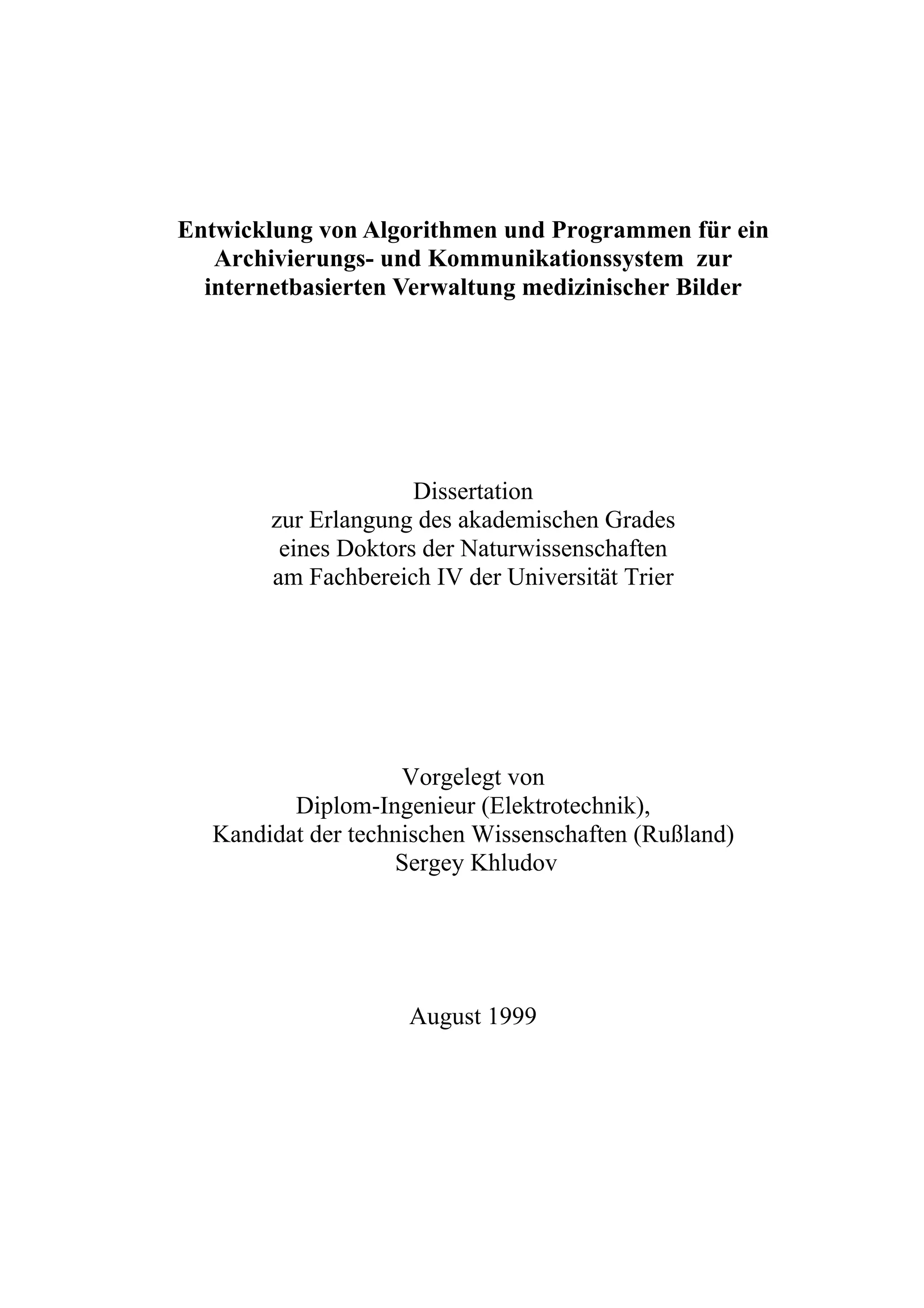 Die Dissertation von Sergey Khludov beschreibt die Entwicklung eines internetbasierten Systems zur Verwaltung medizinischer Bilder. Es wird ein Konzept für ein DICOM-basiertes Radiologieinformationssystem (RIS) präsentiert, das verschiedene bildgebende Geräte integriert und eine benutzerfreundliche sowie effiziente Archivierung und Kommunikation von Bilddaten ermöglicht. Die Arbeit behandelt zudem die Entwicklung von Algorithmen zur Bildkompression und die Implementierung von Java-basierten Übertragungs- und Visualisierungsverfahren für DICOM-Bilder.