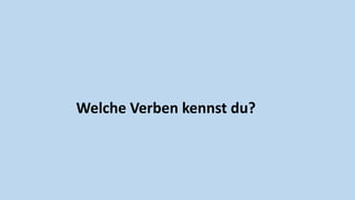 Das Dokument enthält eine Liste von Verben aus verschiedenen Themenbereichen wie Arbeiten, Sport und Kochen. Es werden Beispiele für Sätze mit Dativverben, trennbaren Verben und regelmäßigen sowie unregelmäßigen Verben gegeben. Es werden auch Modalverben und ihre Verwendung in Sätzen behandelt.