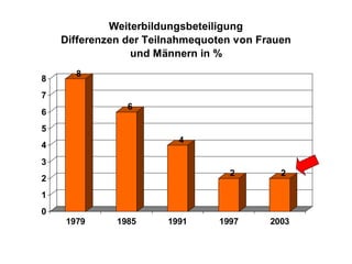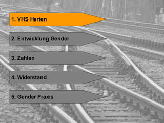 Das Dokument beschreibt das Genderkompetenz-Programm der Volkshochschule Herten, das sich auf Gender Mainstreaming konzentriert und verschiedene Ausbildungs- und Fortbildungsangebote umfasst. Es wird auf die interne sowie externe Entwicklung von Gender-Themen, Widerstand und praktische Umsetzung in der Bildung eingegangen, sowie auf die Bedeutung von Chancengleichheit, Toleranz und Geschlechtergerechtigkeit. Zudem wird die Notwendigkeit hervorgehoben, geschlechtergerechte Didaktik und Angebote zur Förderung von Frauen in verschiedenen Bereichen zu gestalten.