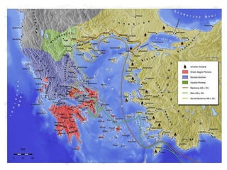 Das Dokument beschreibt die Entwicklung der griechischen Polis, beginnend von ihrer Entstehung im 12. Jahrhundert v. Chr. bis zur Zeit des Hellenismus. Es behandelt wichtige historische Aspekte wie die attische Demokratie unter Perikles, die Perserkriege sowie den Peloponnesischen Krieg zwischen Athen und Sparta. Abschließend wird die Expansion Alexanders des Großen und der anschließende Hellenismus thematisiert, der die kulturelle und politische Landschaft der damaligen Welt prägte.