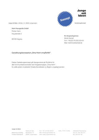 Das Dokument beschreibt die gestaltungskonzeption für die Kommunikationskampagne "oma heim empfiehlt!" der Heim Hausgeräte GmbH, einschließlich Richtlinien und Farbkonzepten für Logo und Anwendungen in verschiedenen Medien. Es bietet Details zur Verwendung des Logos, Farbcodes sowie zu spezifischen Anwendungen in Print- und Onlinemedien. Der Ansprechpartner für die Umsetzung ist Moritz Kempf.