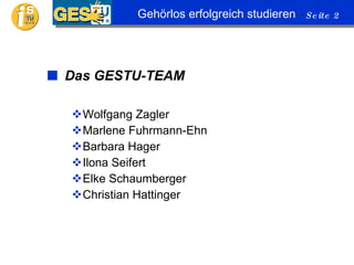 Das Dokument beschreibt das Modellversuch 'Gestu' an der Technischen Universität Wien, der von 2010 bis 2012 lief und darauf abzielt, gehörlosen Studierenden den Zugang zu einer erfolgreichen akademischen Laufbahn zu erleichtern. Es werden Ziele wie die Verringerung des organisatorischen Aufwands und die Erhöhung der Anzahl gehörloser Akademiker in Österreich genannt, sowie die Bereitstellung von Beratungsdiensten und die Sensibilisierung von Lehrkräften. Bewerber müssen gehörlos und gebärdensprachig sein, und das Projekt umfasst die Entwicklung von Fachgebärden sowie regelmäßiges Feedback zur Projektbewertung.