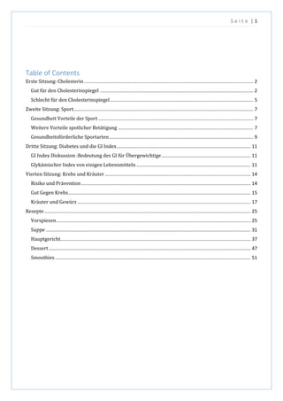 Das Dokument behandelt verschiedene Themen zur Gesundheitsförderung, darunter Cholesterinmanagement, sportliche Betätigung und den glykämischen Index von Lebensmitteln. Es erläutert die positiven Effekte von Lebensmitteln wie Bohnen, Avocados und Knoblauch auf den Cholesterinspiegel sowie die Bedeutung regelmäßiger Bewegung zur Vorbeugung von Krankheiten und zur Verbesserung des allgemeinen Wohlbefindens. Abschließend wird auf die Rolle des glykämischen Index in Bezug auf Übergewichtige eingegangen und die Auswirkungen von Lebensmitteln mit hohem GI auf den Blutzuckerspiegel thematisiert.