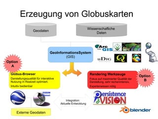 Das Dokument beschreibt den Einsatz von Globusbrowsern und Rendering-Tools zur Generierung und Visualisierung von geowissenschaftlichen Daten. Es werden verschiedene Softwarelösungen vorgestellt und die Unterschiede zwischen interaktiven Globusbrowsern und rechenintensivem Rendering analysiert. Der Fokus liegt auf der Erhöhung der Darstellungsgüte und der Integration externer Geodaten, sowie auf der Bedeutung der Standardisierung im Bereich der Geoinformatik.
