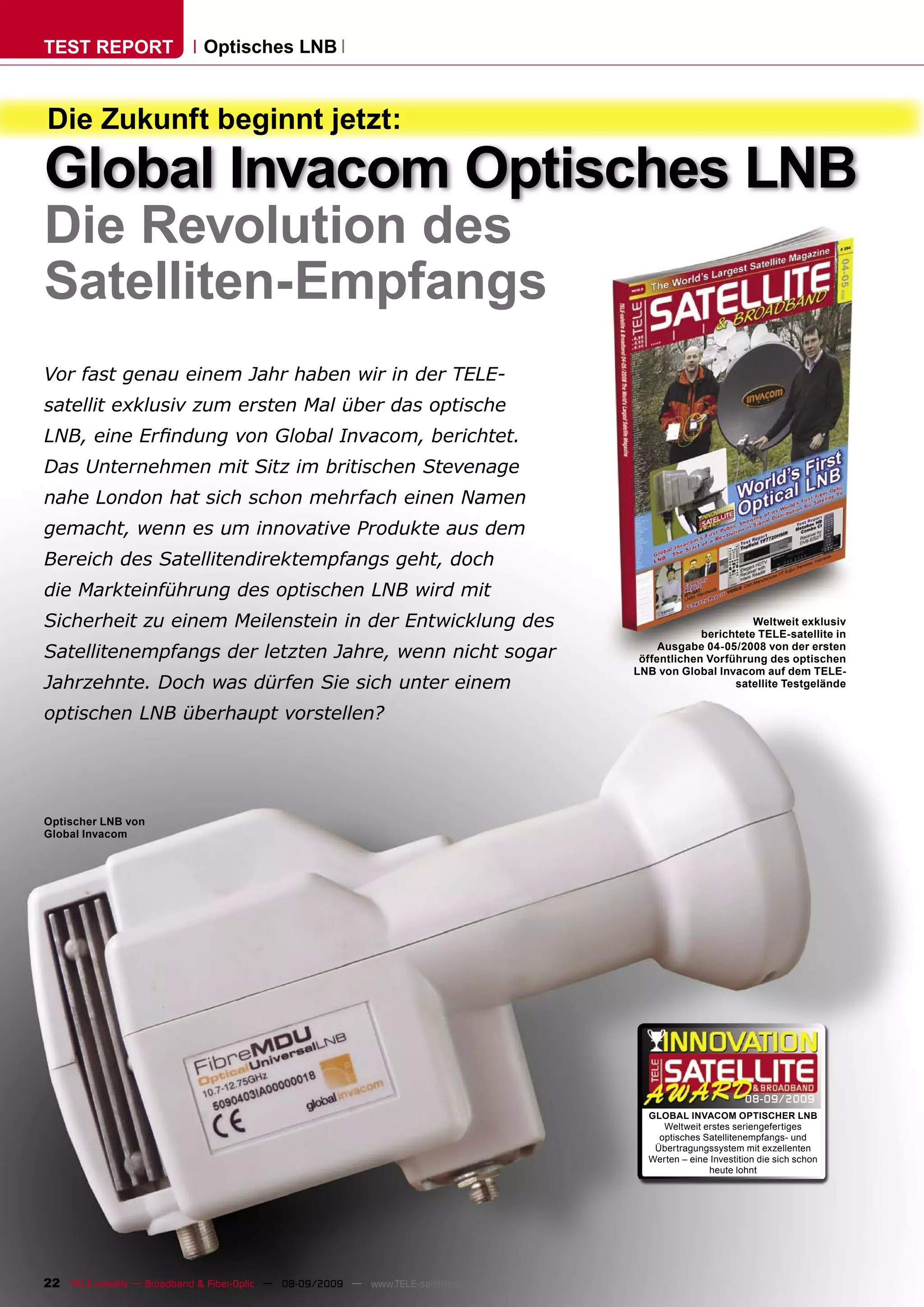 Das Dokument beschreibt das optische LNB von Global Invacom, eine bahnbrechende Innovation im Satellitenempfang, die signifikante Probleme wie Signaldämpfung und die Signalverteilung für mehrere Teilnehmer löst. Es bietet ein System, das Signale über Lichtleiter anstelle von herkömmlichen Koaxialkabeln überträgt, was die Installation erleichtert und die Qualität verbessert. Das optische LNB ermöglicht den Empfang von Satellitensignalen in verschiedenen Frequenzbereichen und mehrere unabhängige Verbindungen über ein einziges Kabel.