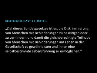 Das Dokument thematisiert die Defizite im Gleichstellungsrecht, insbesondere im Kontext der Rechte von Menschen mit Behinderungen. Es hebt die gesetzgeberischen Ziele hervor, Diskriminierung zu beseitigen und die gesellschaftliche Teilhabe sowie selbstbestimmtes Leben zu fördern. Zudem wird auf die Bilanz und Effektivität bestehender gesetzlicher Regelungen eingegangen, mit dem Fokus auf zukünftige Verbesserungen.