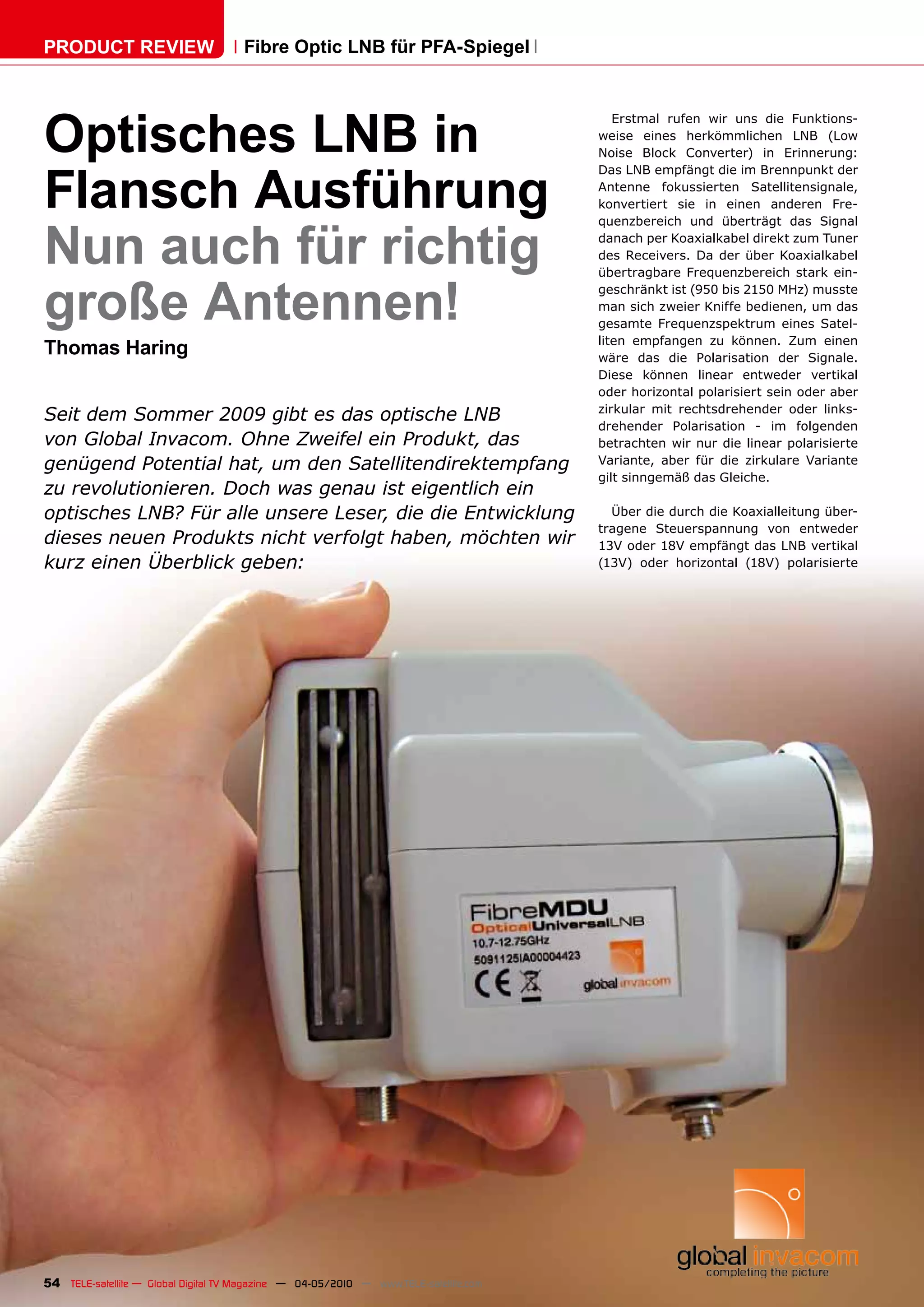 Das Dokument bietet eine umfassende Analyse des optischen LNB (Low Noise Block), das Satellitensignale über Lichtleiter anstelle von herkömmlichen Koaxialkabeln überträgt. Diese Technologie ermöglicht eine unkomplizierte Signalverteilung für mehrere Empfänger und erhöht die Empfangsreichweite erheblich, während die Signalqualität erhalten bleibt. Insbesondere für größere Antennensysteme stellt dieses Produkt eine vielversprechende Innovation dar, die die Installation und Nutzung von Satellitenfernsehen revolutionieren könnte.