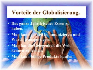 Globalisierung beschreibt den zunehmenden internationalen Austausch in verschiedenen Bereichen wie Wirtschaft, Politik und Kultur, was Vorteile wie Zugang zu frischen Lebensmitteln und günstigeren Produkten mit sich bringt. Sie führt zu einer Zusammenarbeit zwischen Ländern, um Produkte zu schaffen, schafft neue Arbeitsplätze durch steigende Exporte und kann auch zur Verlagerung von Arbeitsplätzen in Niedriglohnländer führen. Das Spannungsfeld zwischen Wettbewerb und sozialstaatlichen Reformen wird hervorgehoben, da die Kosten für soziale Absicherung im Verhältnis zum Arbeitslohn steigen.