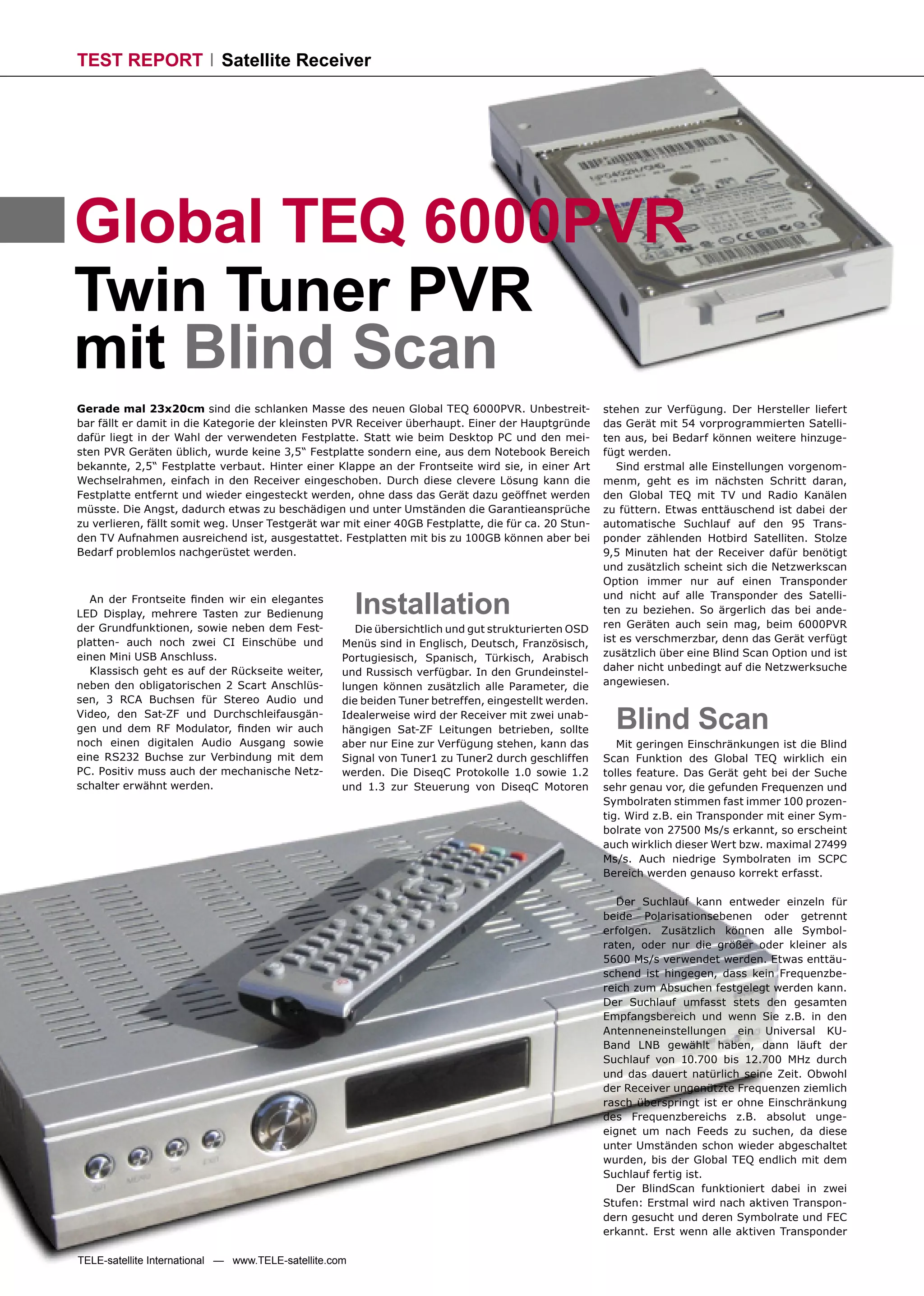 Der Global Teq 6000PVR ist ein kompakter Twin-Tuner PVR mit einer 2,5" Festplatte und einer Vielzahl von Funktionen, darunter eine Blind-Scan-Option und ein benutzerfreundliches OSD. Er bietet Unterstützung für 54 Satelliten und ermöglicht eine einfache Festplatteninstallation sowie schnelle Suchläufe, obwohl der Empfangsbereich im Blind-Scan nicht festgelegt werden kann. Trotz kleinerer Softwareprobleme ist der Receiver gut ausgestattet und könnte durch zukünftige Updates weiter verbessert werden.