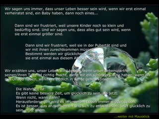 Das Dokument thematisiert die Illusion, dass Glück von zukünftigen Lebensereignissen abhängt, und ermutigt den Leser, im gegenwärtigen Moment glücklich zu sein. Es wird betont, dass Herausforderungen zum Leben gehören und dass wahres Glück in zwischenmenschlichen Beziehungen und im Helfen anderer liegt. Durch persönliche Reflexion und Anekdoten wird die Botschaft vermittelt, dass das Streben nach Glück eine Reise ist, die im Hier und Jetzt beginnt.