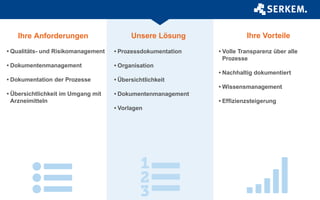 Das Dokument beschreibt die Umsetzung der GMP-Systemvalidierung in SAP zur Erfüllung von Qualitätsanforderungen für Arzneimittel und Wirkstoffe. Es erläutert die Unterschiede zwischen Qualifizierung und Validierung sowie die verschiedenen Phasen des Validierungsprozesses und die Anwendung des V-Modells zur Qualitätssicherung. Serkem GmbH positioniert sich seit 1997 als kompetenter Partner für Unternehmen in der Implementierung von SAP-Lösungen.