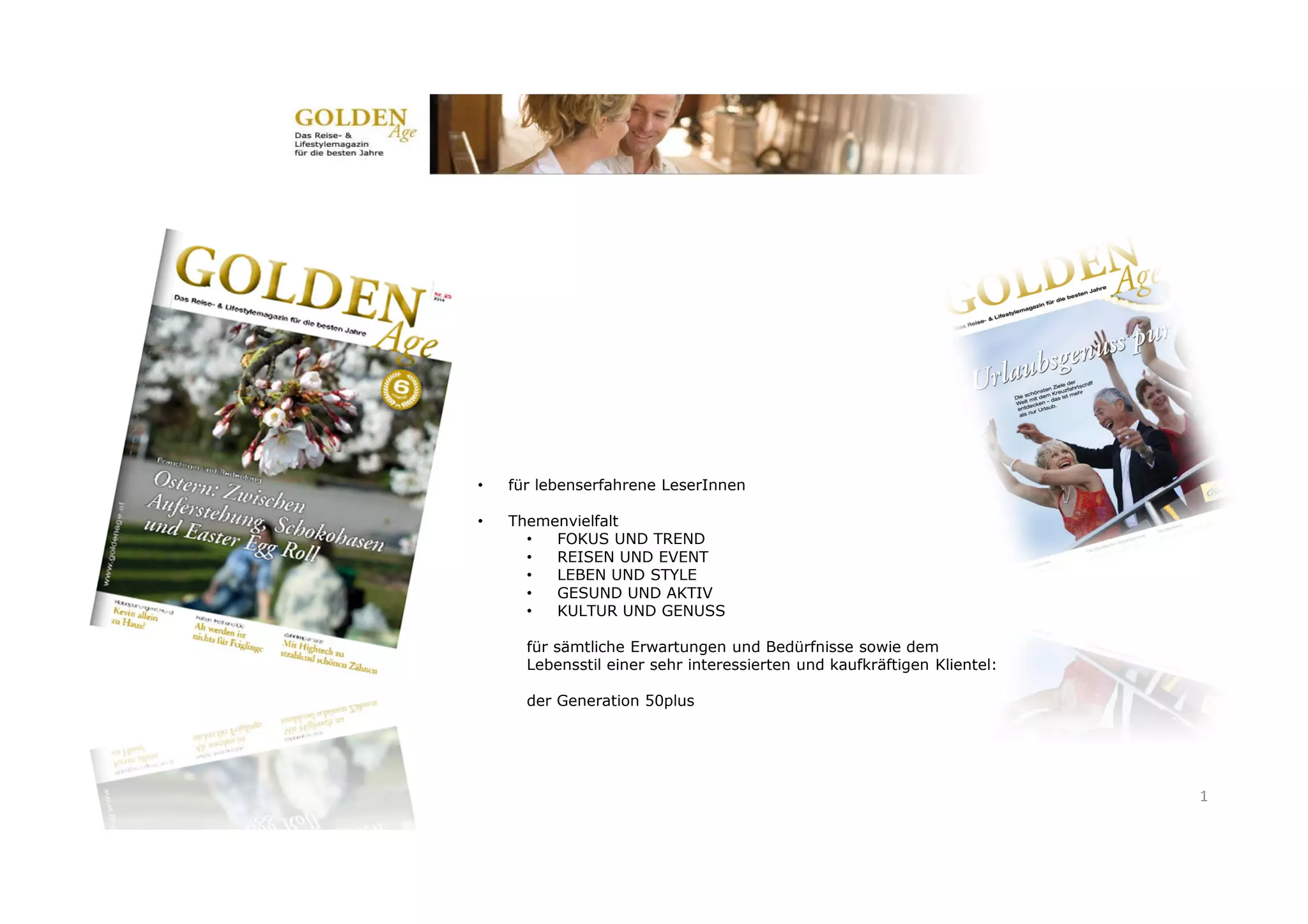 Das Dokument beschreibt ein Magazin, das sich an die generation 50plus wendet, mit Themen wie Reisen, Lebensstil, Gesundheit und Kultur. Es hat eine Auflage von 34.500 Exemplaren und richtet sich an eine kaufkräftige Zielgruppe, die hauptsächlich in den Altersgruppen von 45 bis 65 Jahren vertreten ist. Die Verteilung erfolgt persönlich adressiert und umfasst unter anderem Verbände, Arztpraxen und relevante Veranstaltungen.