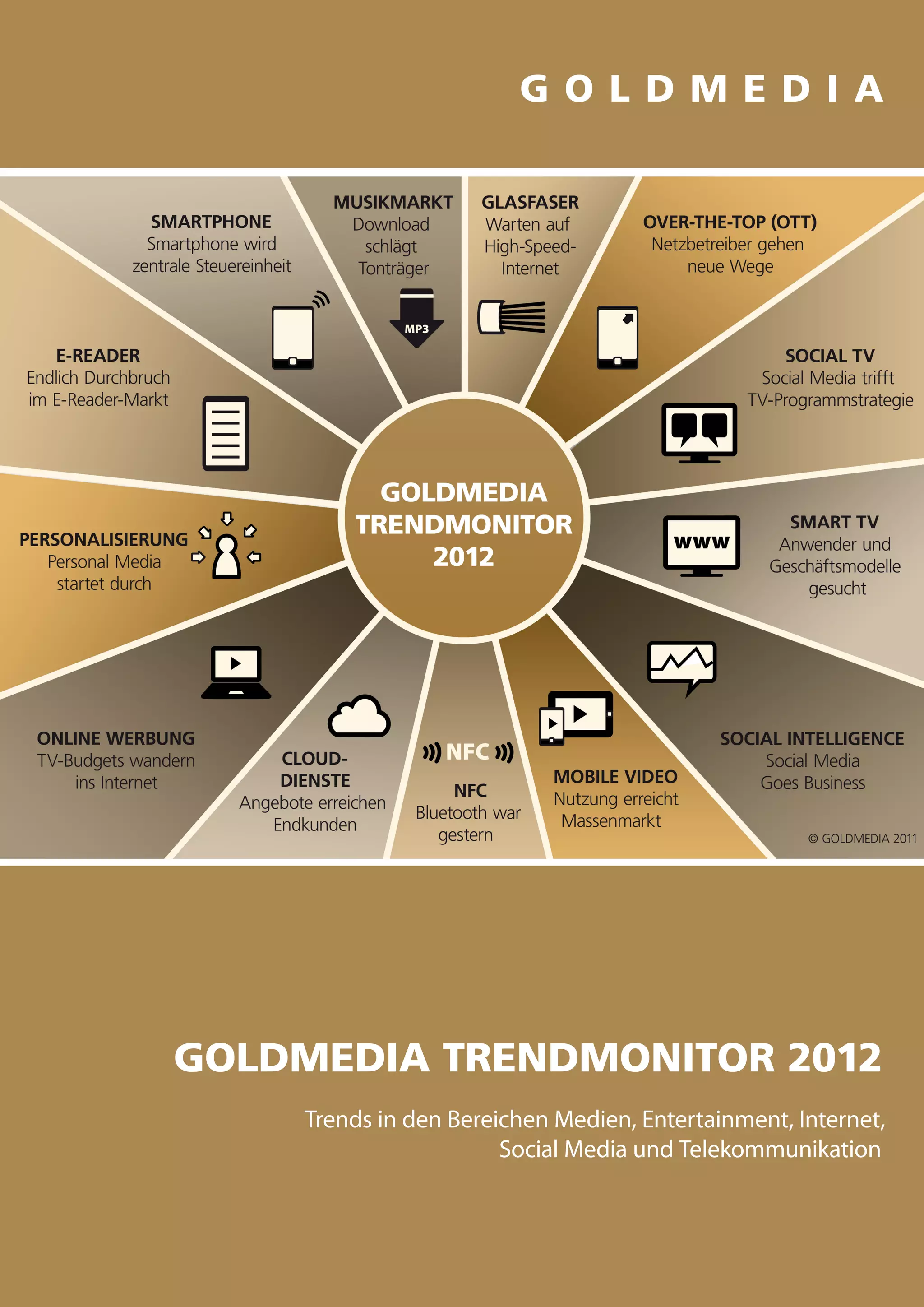 Der Goldmedia Trendmonitor 2012 gibt einen Ausblick auf bedeutende Entwicklungen in den Medien-, Entertainment- und Telekommunikationsbranchen in Deutschland, wobei das Smartphone als zentrale Steuerungseinheit, der Durchbruch von E-Readern und das Ende der CD-Ära hervorstechen. Zudem wird die Bedeutung von Social Media für das Fernsehen und die wachsende Nutzung von Cloud-Diensten thematisiert. Herausforderungen wie stagnierender Glasfaserausbau und die Notwendigkeit innovativer Geschäftsmodelle werden ebenfalls angesprochen.