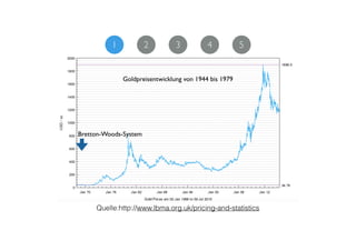Das Dokument behandelt die Goldpreisentwicklung von 1944 bis heute, einschließlich Phasen wie das Bretton-Woods-System, die Finanzkrise, den Irakkrieg und die europäische Schuldenkrise. Es beleuchtet die Chancen und Risiken einer Investition in Gold, sowie spezifische Risiken wie Transport- und Lagerkosten. Zudem wird zur weiteren Vertiefung auf einen Blogartikel und eine Präsentation verwiesen.